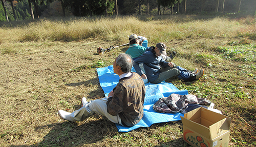 私たちの集落では稲作農家全員がイノシシ被害防止のため電気柵を設置しています。イノシシの被害は尋常ではありません。最初は偵察隊が様子を伺いにきます。稲の中にかき分けて入ったような跡が残るから分かります。ほっておくとある日一族揃って襲来し一夜にして稲が踏み倒され、田面が掘り起こされたような無残な姿に変わります。春から丹精込め、さあこれから収穫という時に、その悔しさは言葉に言い表せません。設置も撤収も共同で行います。早朝からの作業で疲れ、一服のひと時です。